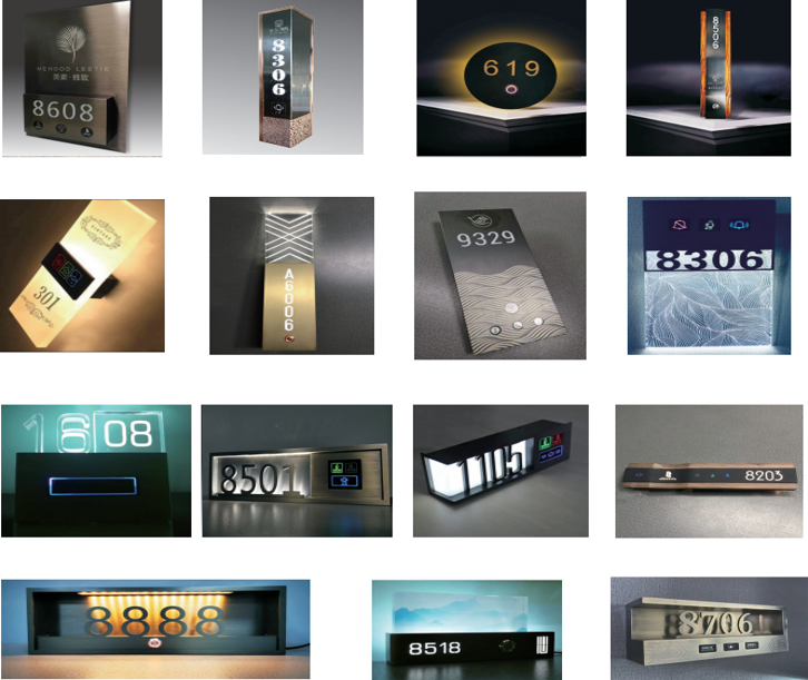 智能门牌 智能门牌 1.LoRa通信只接零火线,安装更简单;2.空房、已入住、脏房、勿扰、清扫、稍后、SOS联动显示,即时同步酒店值班人员;3.按下”SOS“键,门牌所有指示灯进入闪烁状态,同时自动推送前台值班人员;4.门牌样式/材质支持定制。