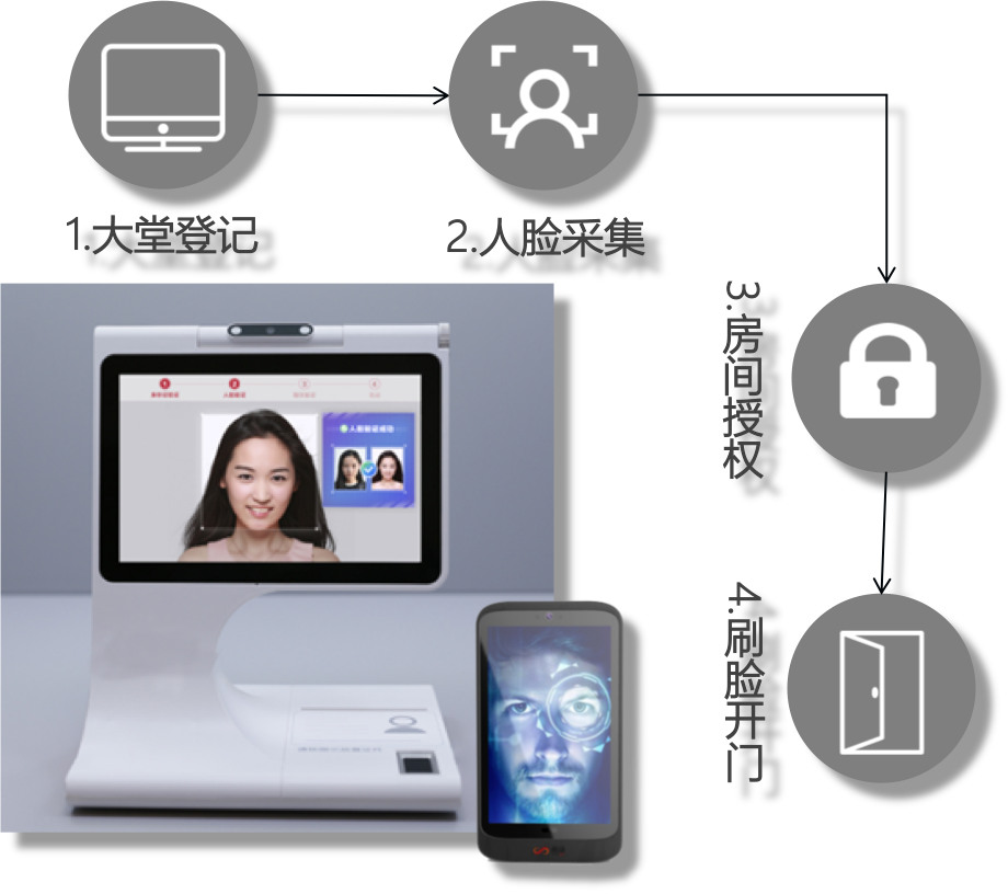 人脸识别系统 1.智能前台通过无感拍照、读取身份证,快速人脸比对,将住客信息及时上传公安旅业系统;2.智能前台取代传统人工前台, 为住客提供一种自助化的入住体验,提高酒店智能化水平,解放的人工可以为客人提供更有温度的服务。